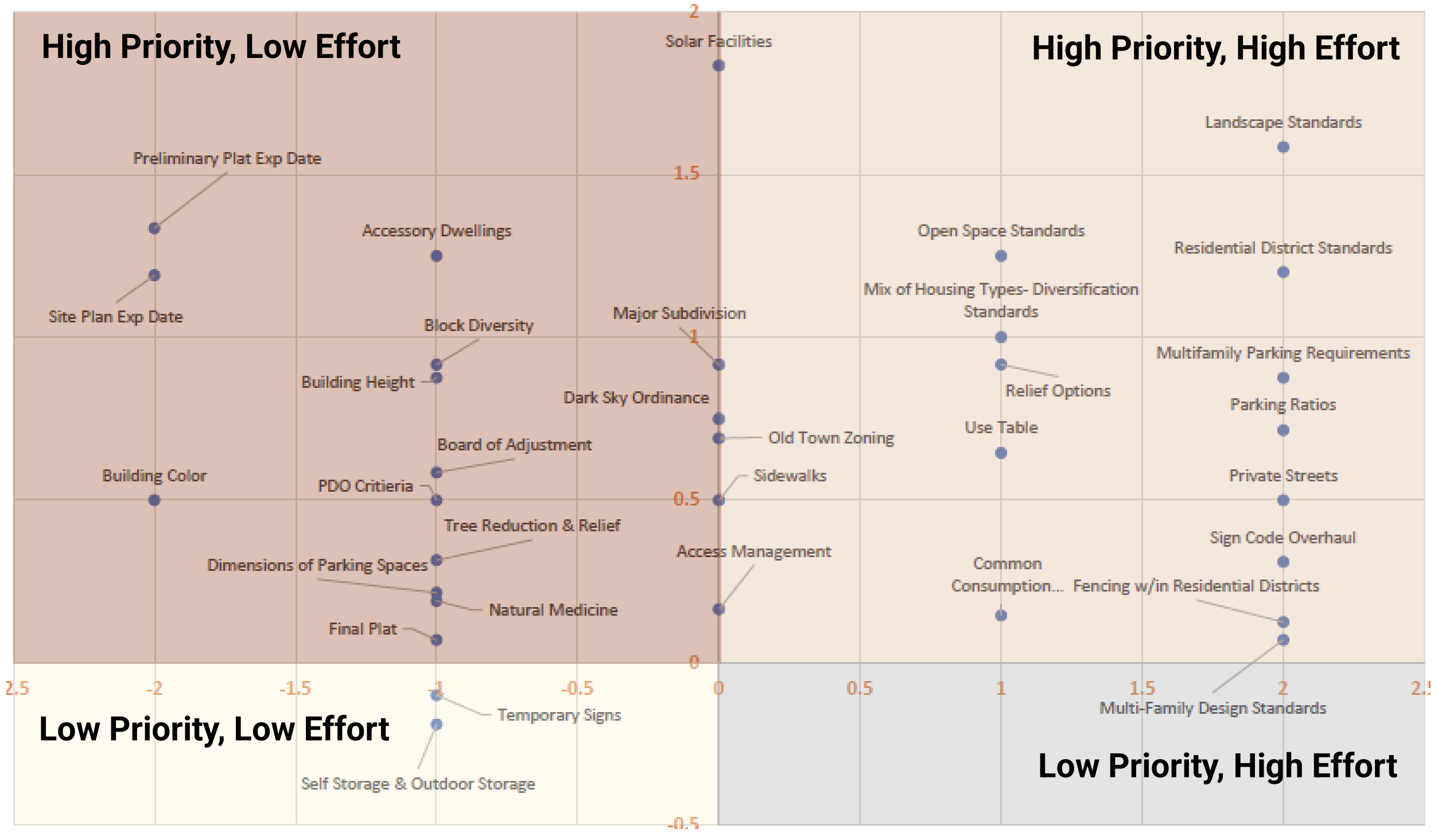 Effectiveness Rating (Y-axis): The Planning Commission and Staff rated the importance of each amendment, with ratings indicating urgency and potential impact on town planning goals: