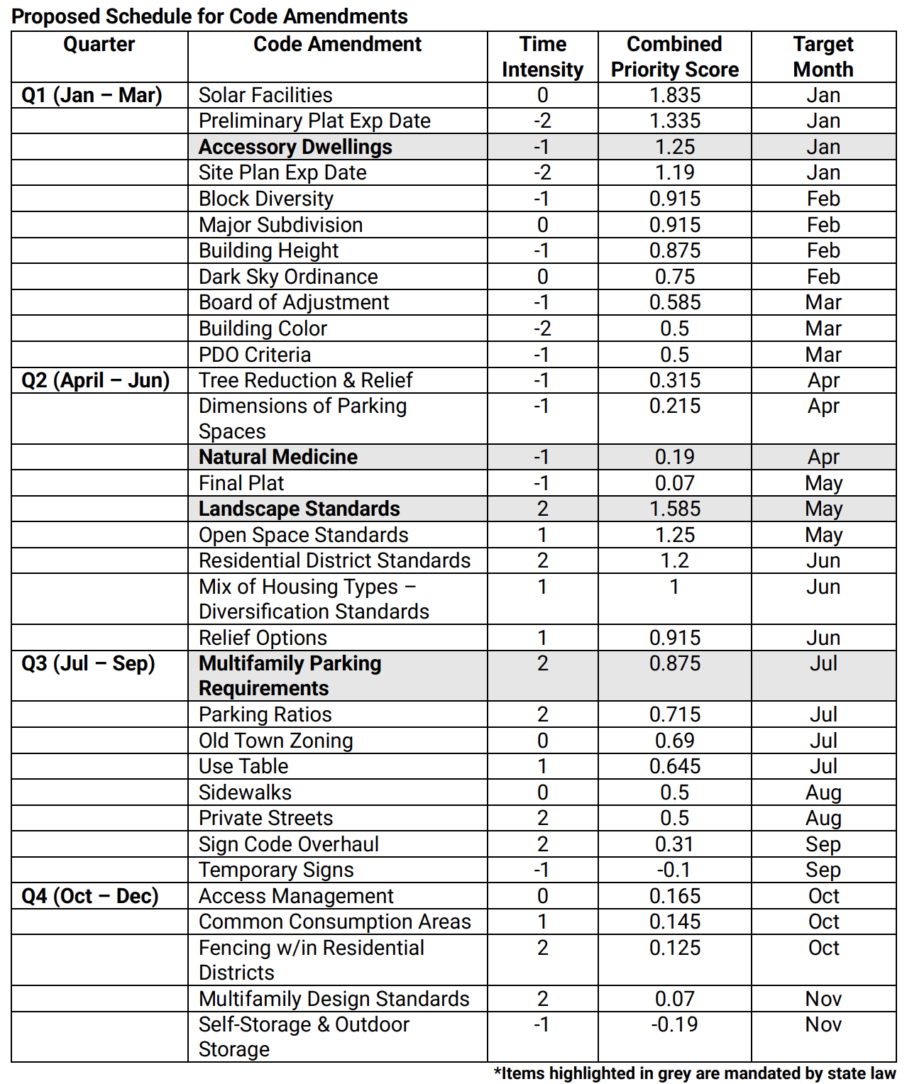 This prioritized, phased approach enables a manageable schedule for implementing Land Use Code amendments throughout the year. Items are categorized based on their impact and staff effort required, aiming to address high-priority and low-effort items first. The proposed schedule is ambitious, and timelines may be adjusted as necessary to accommodate workload and unforeseen delays.